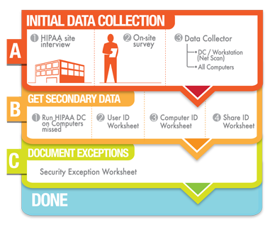 This is the first product of its kind that automatically collects -- and seamlessly integrates -- the mountain of network data needed for a comprehensive HIPAA Risk Analysis and combines it with the photos, observations and supplemental data you gather on site. All the data is crunched by our HIPAA risk assessment engine, and reports are then automatically generated with YOUR customized branding.